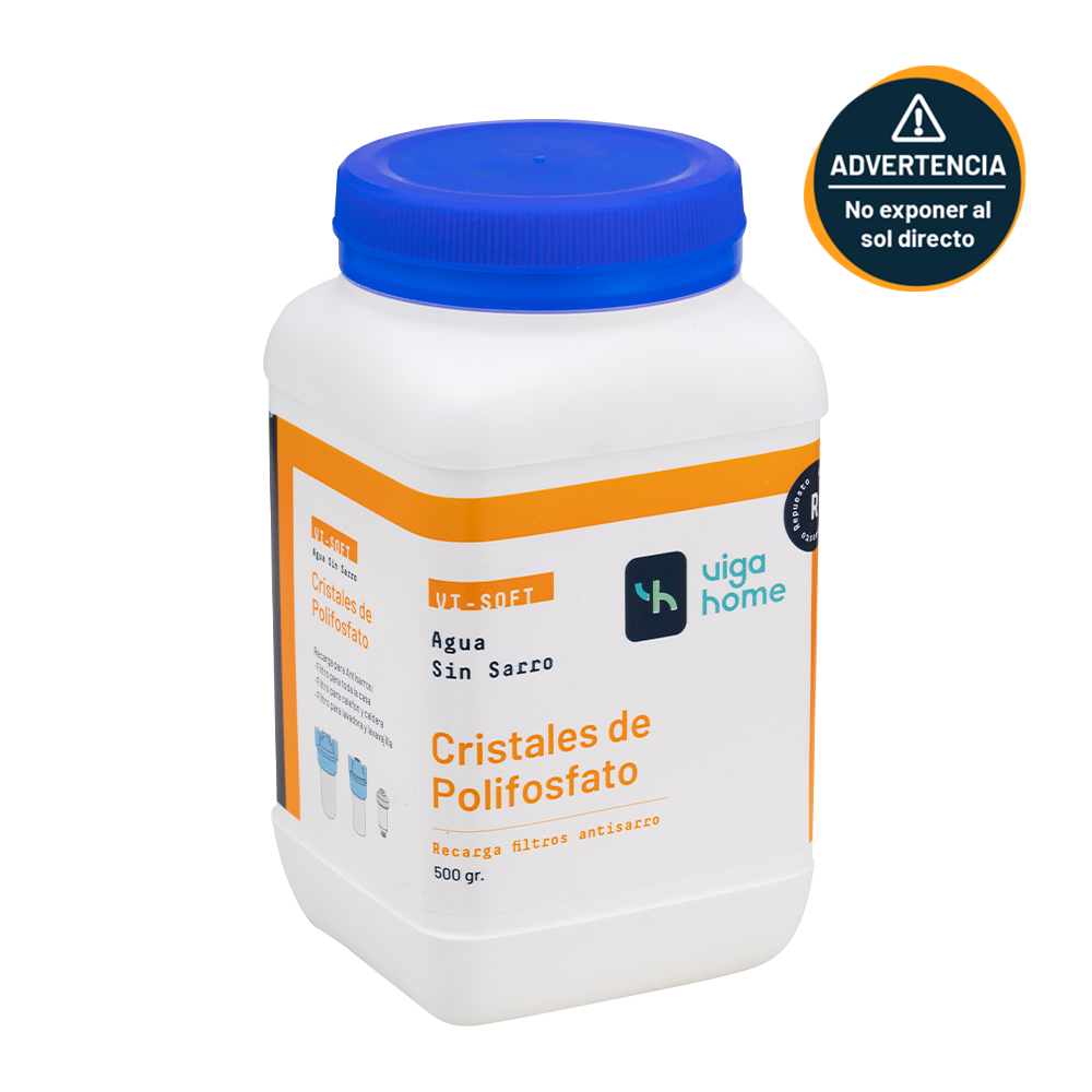 Cristales de polifosfato con grado alimenticio que funcionan como recarga de filtro antisarro. Los cristales de polifosfato mantienen en suspensión el calcio y magnesio, lo que permite evitar la formación de sarro.
